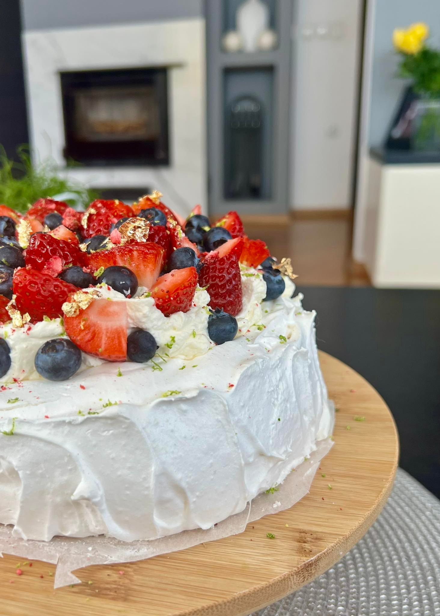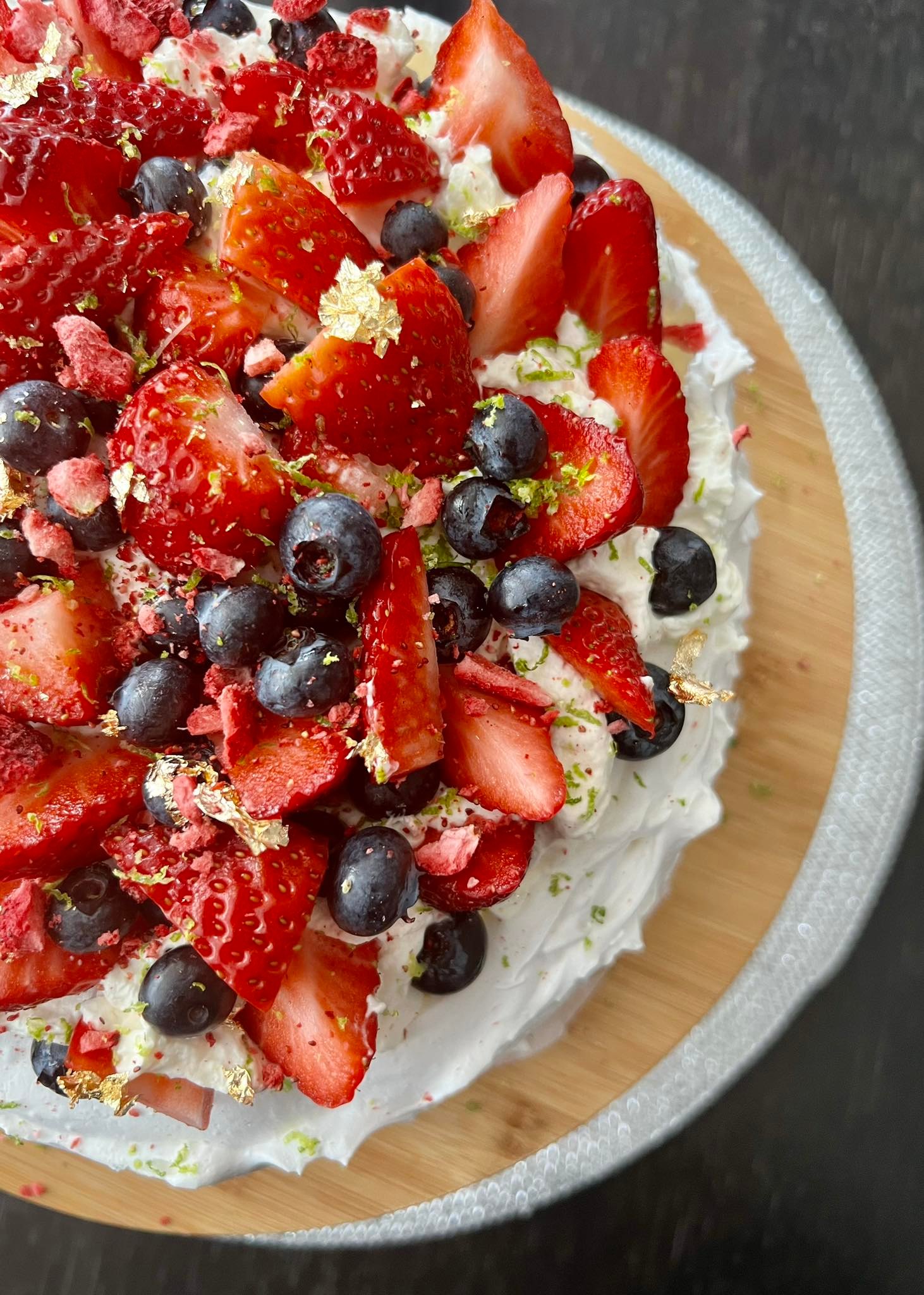 8. S kremo napolnimo vdolbino meringe, nato pa okrasimo s poljubnimi jagodičevjem ali drugim sadjem. Čez naribamo limetino lupinico, nadrobimo liofilizirane jagode in dodamo jedilno zlato.