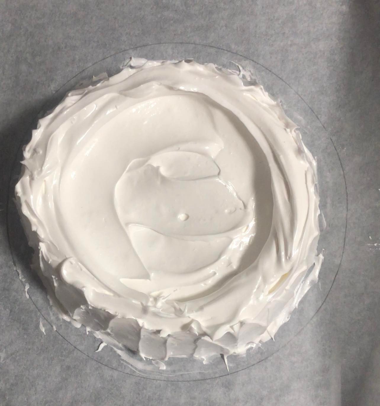 - Na peki papir v zarisan krog dodajamo beljak s pomočjo žlice, da dobimo lepo obliko. Nato s spatulo zgladimo robove od spodaj proti vrhu, notranjost pa poglobimo, da dobimo lep rob. V vdolbino bomo kasneje dodali smetanovo kremo.