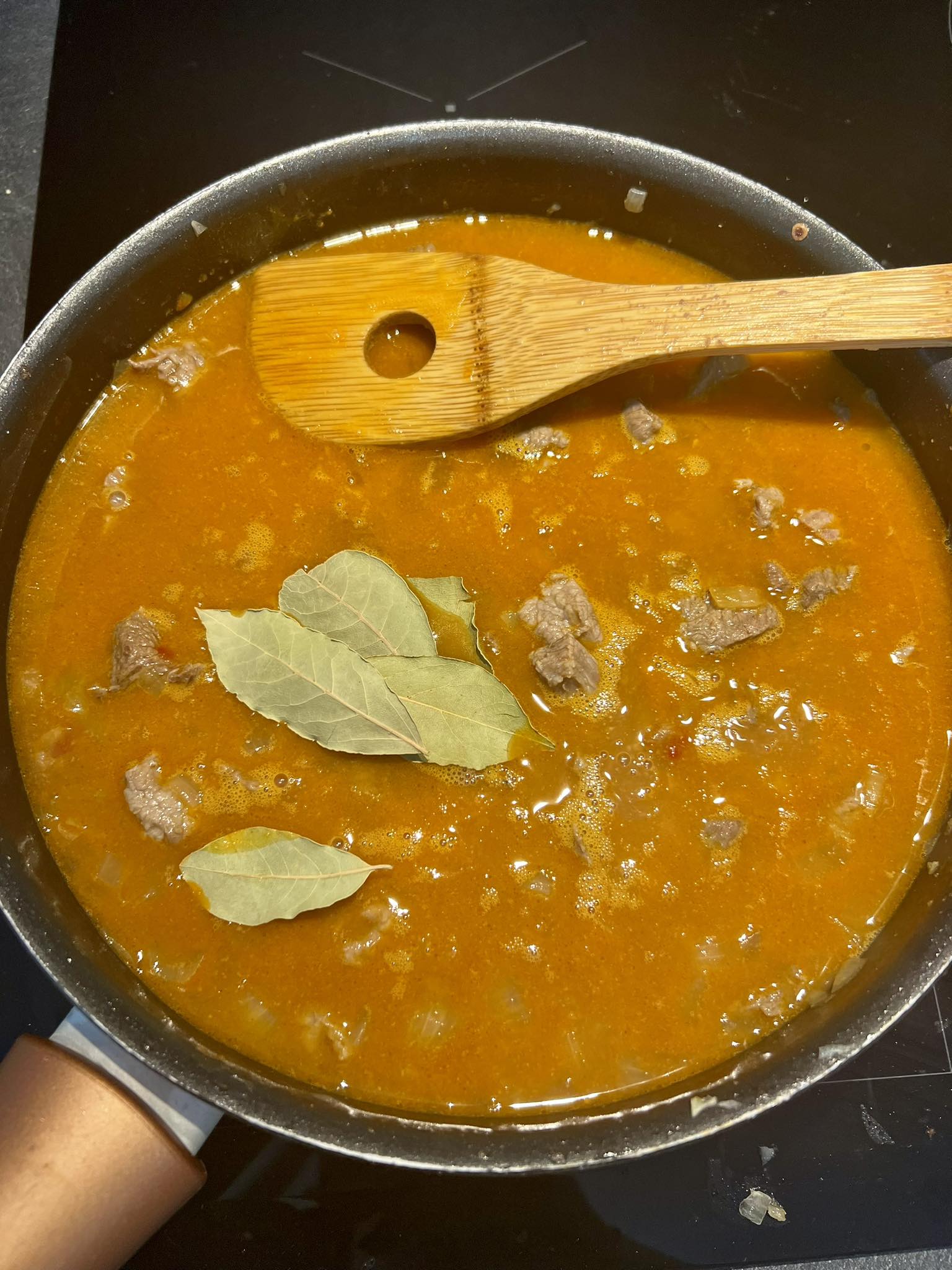 3. Dodamo mlete paprike in paradižnikovo mezgo, vse dobro premešamo in nato dodamo kocke popečenega mesa. Na tej točki solim meso, vendar ne preveč, saj potrebno količino soli in popra določim proti koncu kuhanja (sem se že pošteno zasolila v tej fazi!). Zalijemo z rdečim vinom, in mešamo toliko časa, da nam vino izpari, nato zalijemo z cca. 700ml vode in dodamo lovorjev list.